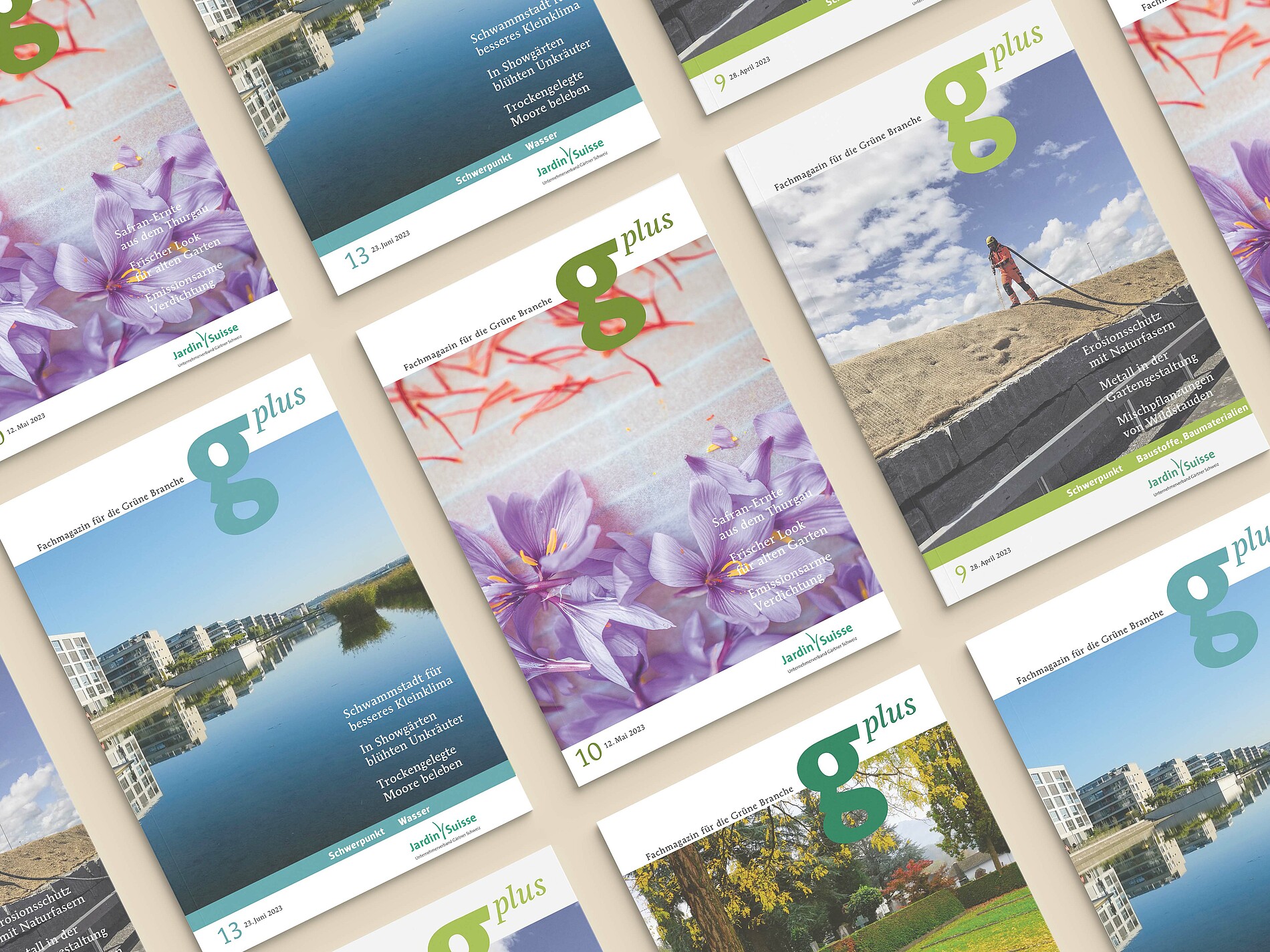 «g’plus» und «g’plus ROMANDIE» sind Fachmagazine für die Grüne Branche und Teil der Kommunikation von JardinSuisse. Einerseits berichten sie über die Tätigkeiten, Entscheide und Veranstaltungen des Verbands. Andererseits informieren Fachartikel umfassend über das Geschehen in der Grünen Branche. Wichtige Schwerpunktthemen sind beispielsweise Siedlungsgrün, Substrat & Vitalität und Grün- & Hartflächenpflege. Vermehrt hat die Redaktion zudem Beiträge zu Pflanzkonzepten, Bautechnik und Management veröffentlicht.